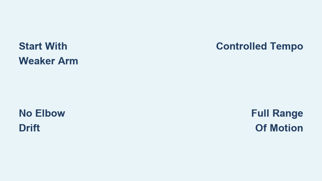 Critical: Never match the stronger arm’s weight to the weaker one—that just reinforces imbalance. Let the weaker arm set the standard.