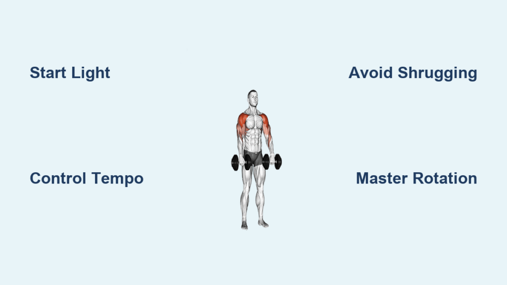 Stand with feet shoulder-width apart, knees slightly bent for stability. Hold dumbbells at your sides with palms facing your thighs. Before moving, brace your core like preparing for a punch and actively pull your shoulder blades “back and down” as if sliding them into back pockets. This critical step prevents the shrugging that causes 80% of injuries. Your entire spine should maintain neutral alignment from head to pelvis—no forward head posture or rib flaring.