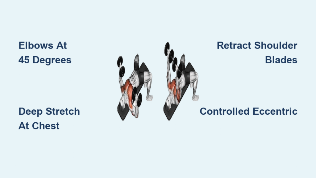Solution: Actively tuck elbows to 45 degrees throughout the movement. This critical adjustment protects your shoulder joints while maintaining optimal pec activation. Think “elbows slightly forward” as you lower the weights—your wrists should stay directly above your elbows at the bottom position.