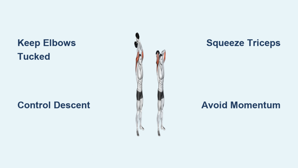 Elbow positioning makes or breaks this exercise. Keep elbows pointed directly forward, tucked close to your head throughout the movement. When elbows drift outward, tension shifts away from the triceps toward the shoulders. Imagine your elbows are glued to your ears—this mental cue prevents common form breakdown.