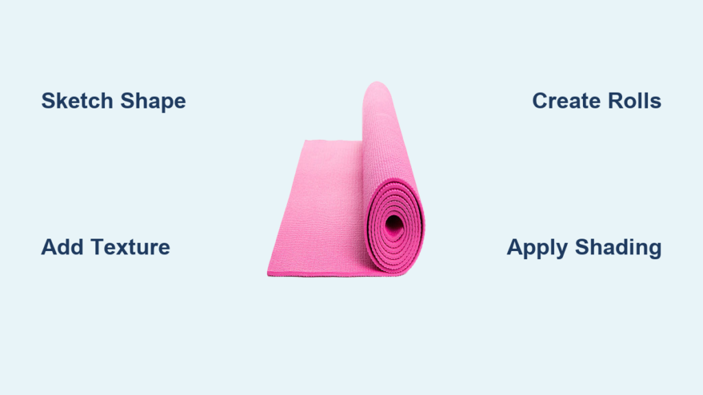 For partially rolled mats, the transition zone between tight roll and flat unrolled section requires careful attention. This area typically shows the mat bending rather than sharply creasing, creating subtle ripples. Sketch these as gentle curved lines following the material’s flow, then shade along one side of each ripple to suggest depth. Ripples closest to the roll appear tighter and more compressed.