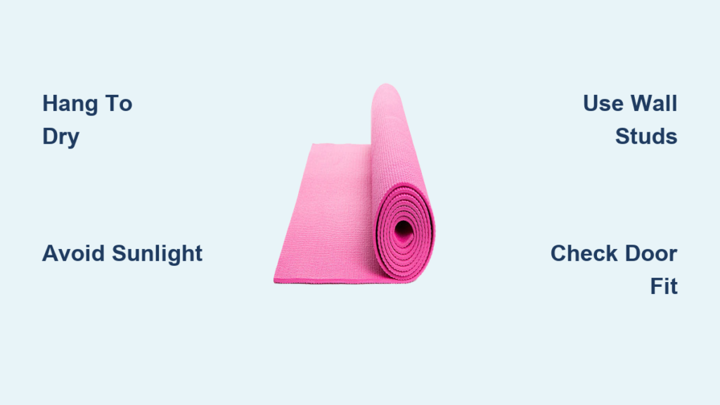 Avoid direct sunlight when choosing a hanging location—UV rays degrade yoga mat materials over time, causing cracking, fading, and reduced cushioning. North-facing walls typically receive less direct sunlight than south or west-facing walls.
