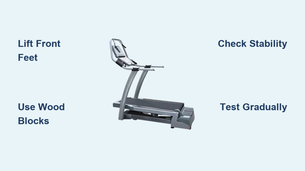 Position risers directly under both front feet only. Measure your treadmill’s front base width first—typically 24-30 inches—then cut blocks ½ inch wider for stability. If your floor slopes, place thin rubber shims under the lower side of blocks to prevent lateral drift. Exceeding 4.5 inches of total lift risks rear-foot separation, which twists the frame and voids safety certifications.