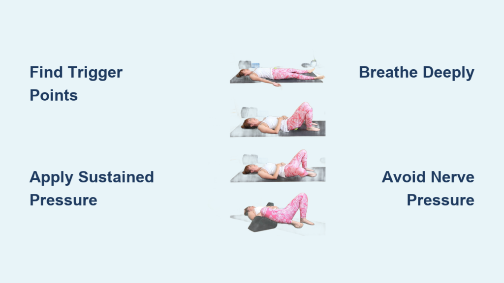 For sciatic pain relief, target the piriformis muscle beneath the gluteus maximus. Lie on your back with knees bent, then cross one ankle over the opposite knee into a figure-four position. Place the tennis ball under the crossed hip, just below the bony sacrum. Apply steady pressure for 45 seconds—you should feel deep release in the hip socket. This position specifically addresses piriformis syndrome, a common cause of radiating leg pain.