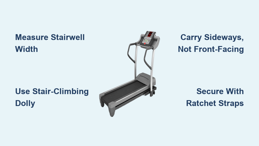 Your staircase width is the make-or-break factor. If it’s under 36 inches wide (most are 32–34″), you must carry the treadmill sideways—narrow edge first—to avoid crushing handrails. Pull out your tape measure now and check three critical points: