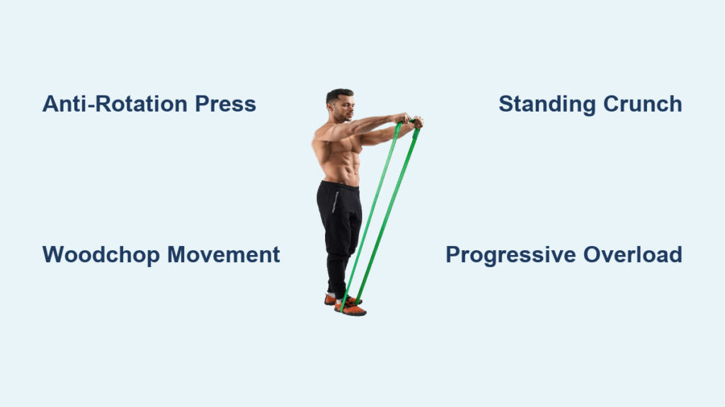Start with light bands allowing 15-20 perfect repetitions per set, focusing entirely on movement quality. Begin each session with 5 minutes of light cardio. Perform Pallof Press for two sets of 12 reps per side, concentrating on resisting rotation. Follow with two sets of 15 standing banded crunches per side, then complete with two sets of 12 band-resisted Russian twists per side. Rest 45 seconds between sets.