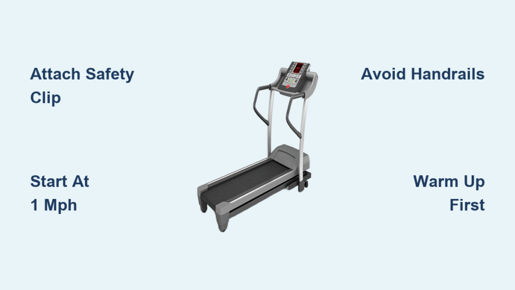 That red clip isn’t optional—it’s your lifeline. Attach the magnetic safety key to your shirt collar before stepping on. If you stumble or drift backward, it instantly stops the belt. Skipping this causes 42% of treadmill falls. Locate the emergency stop button (usually large and red) with your eyes while the machine is off. Test both start (green) and stop (red) buttons while stationary—panic makes you fumble when you need them most. Never step onto a moving belt; wait for complete stop before mounting or dismounting. This single rule prevents “jump-on” injuries that send beginners tumbling.