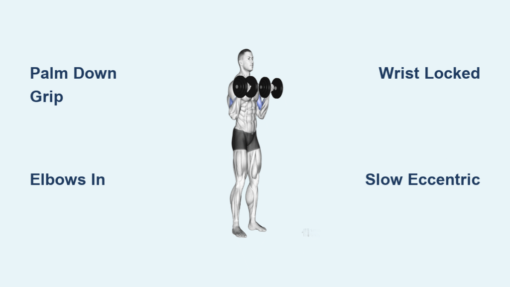 Stand with feet hip-width apart, core braced like you’re about to be punched. Grip dumbbells with palms facing down, thumbs wrapped securely around the handles. Pin elbows firmly against your torso sides while pulling shoulders back and down. Critical detail: Lock wrists in neutral alignment—knuckles, wrists, and elbows must form a straight line before moving. Any wrist bend here sabotages muscle targeting.