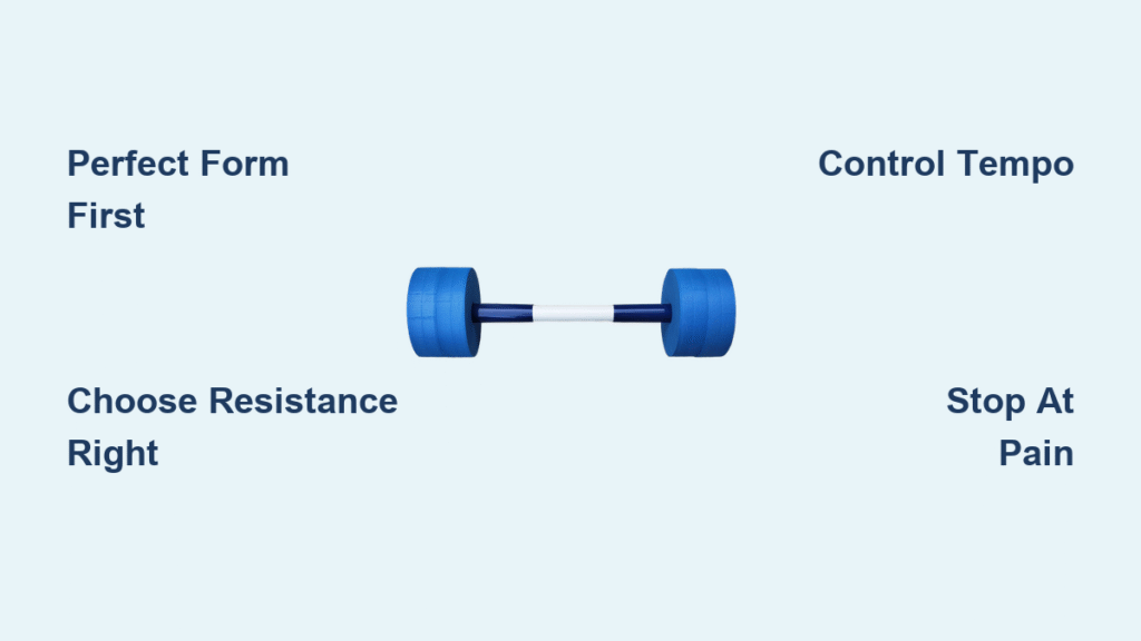 Weeks 1-2: Focus on perfect form with light resistance. Complete all exercises at 2-0-2 tempo. Weeks 3-4: Increase to medium resistance and slow to 3-0-3 tempo. Weeks 5-6: Introduce heavier foam blocks while maintaining controlled movement. Weeks 7+: Reduce rest periods between sets by 15 seconds weekly. Critical warning: Never add resistance while form breaks down – water amplifies momentum injuries.